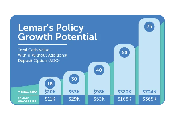 With a 20-Pay Whole Life Policy, Susan can rest easy knowing payments will stop after 20 years – but Lemar’s coverage will stay in place for the rest of his life. Without her advisor’s expert guidance, Susan wouldn’t have known that she could double Lemar’s growth and still remain under budget.